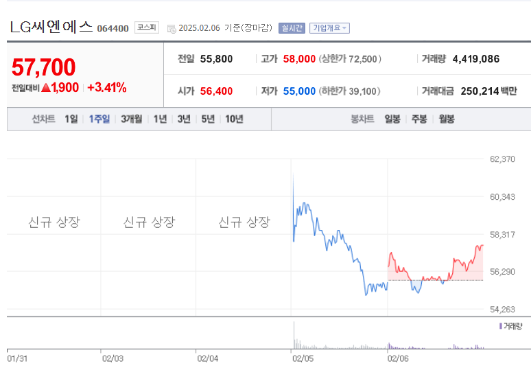 LG CNS는 2025년 2월 5일 코스피 시장에 상장하며 많은 기대를 모았습니다. 그러나 상장 첫날 공모가인 61,900원 대비 하락하고 있는데요. 2월 6일 기준 57,700원입니다.
