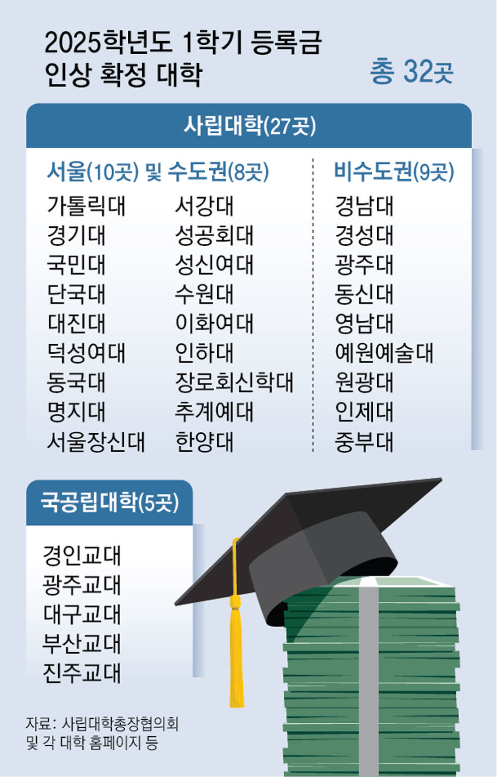 최근 2025년 1학기 등록금 인상 확정 대학은 총 32곳이라고 합니다.('25.1.24. 기준)