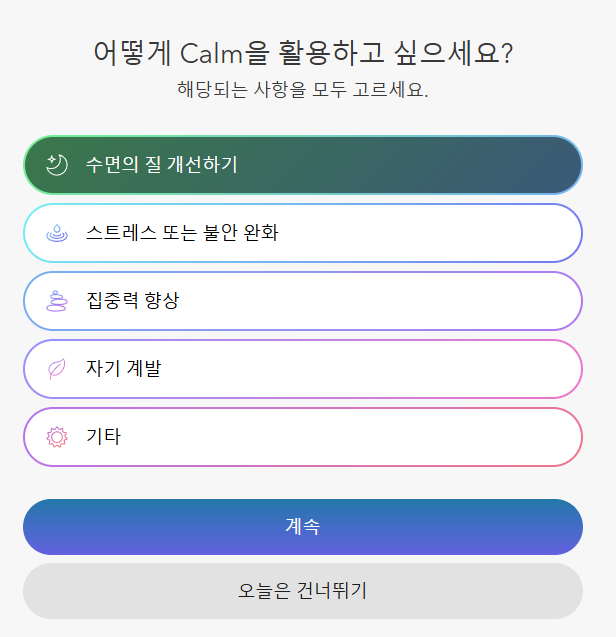 아래처럼 선택하면 맞춤형 프로그램을 제공하니, 수면 개선과 스트레스 해소를 원하는 분들에게 적극 추천합니다.