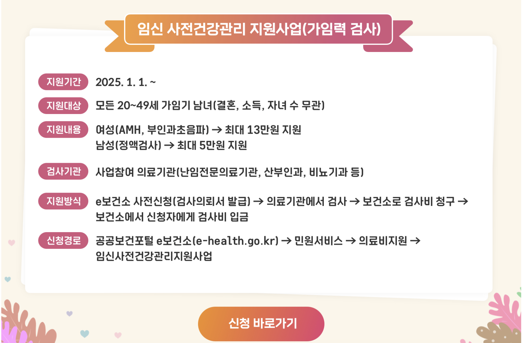 - 임신을 희망하는 부부를 대상으로 시행되며, 가임력 검사비(AMH, 부인과 초음파, 정액검사) 지원이 포함됩니다.