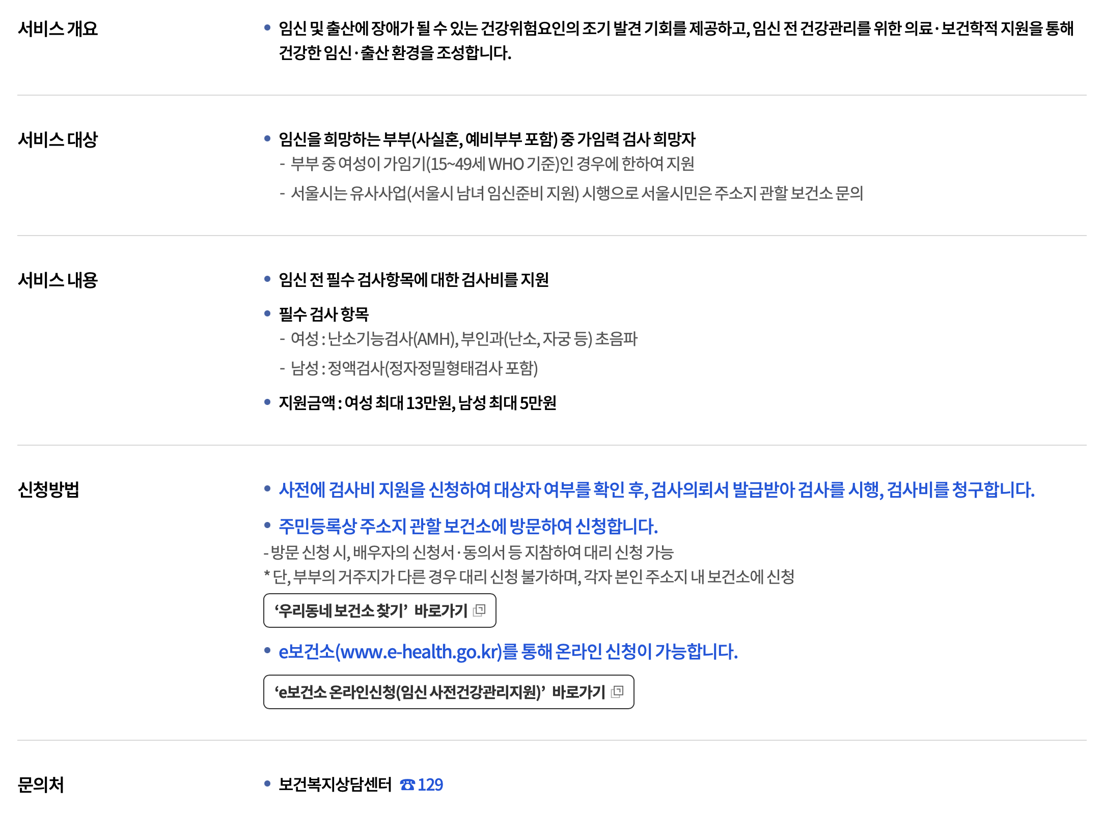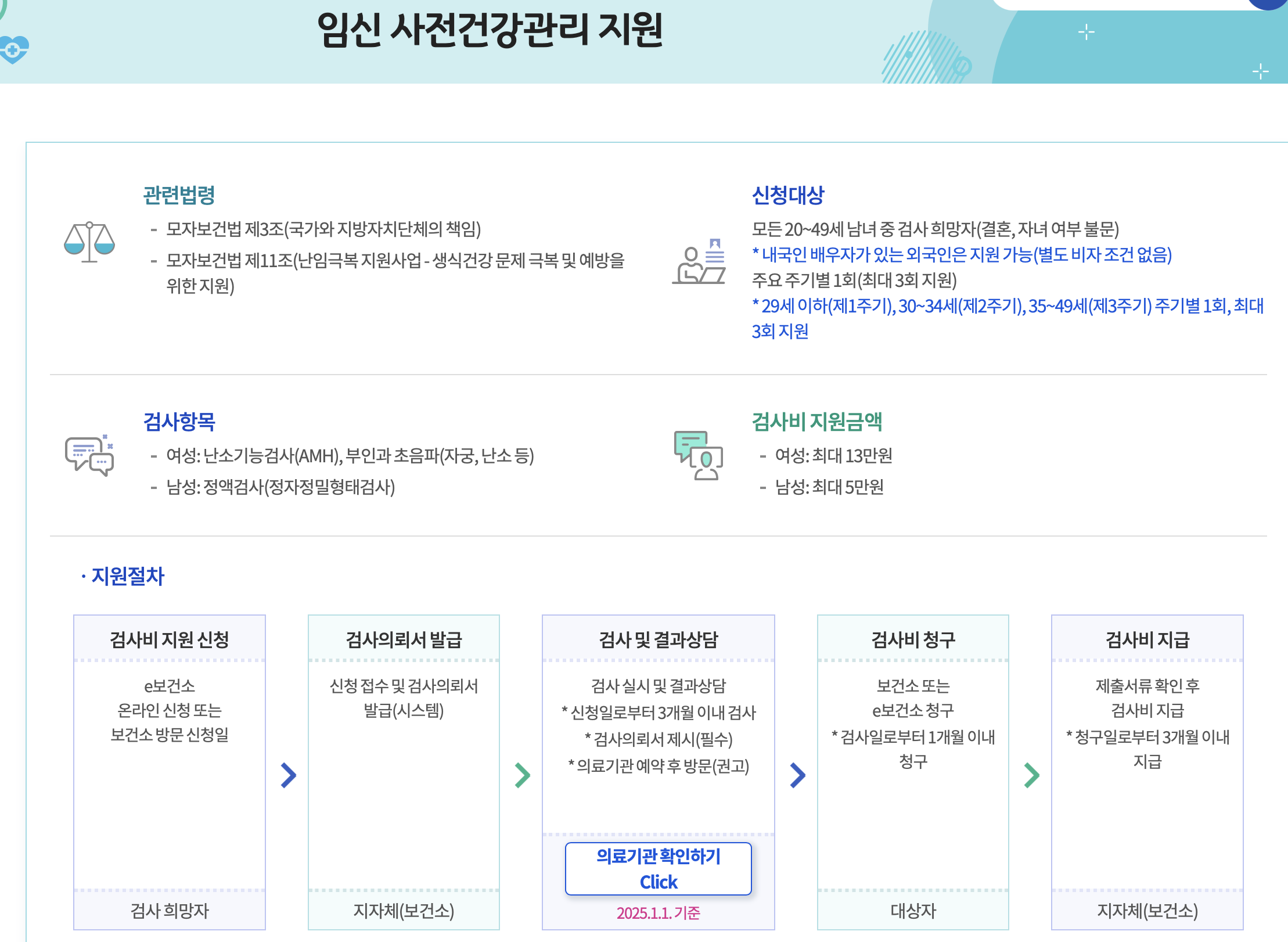 - 여성: 난소기능 검사(AMH), 부인과 초음파(자궁, 난소) → 검사비 최대 13만 원 지원