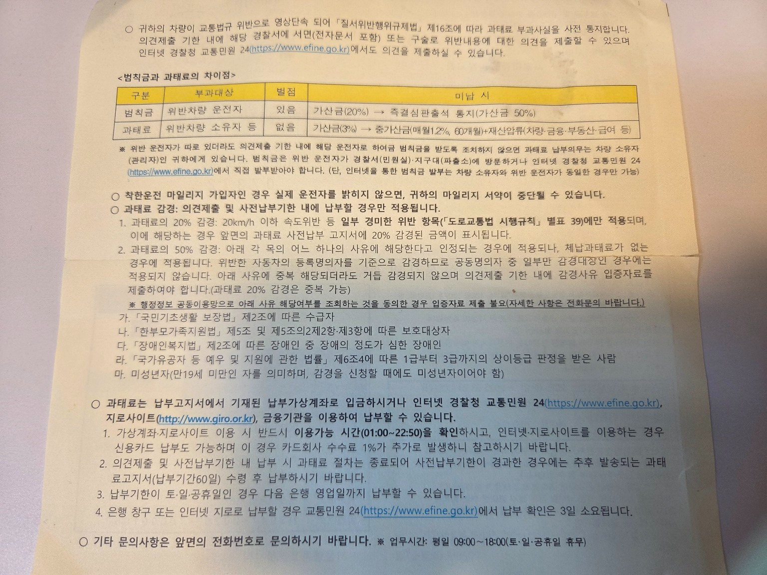 - 과태료 금액의 1% 수수료 발생 (예: 10만 원 납부 시 1,000원)