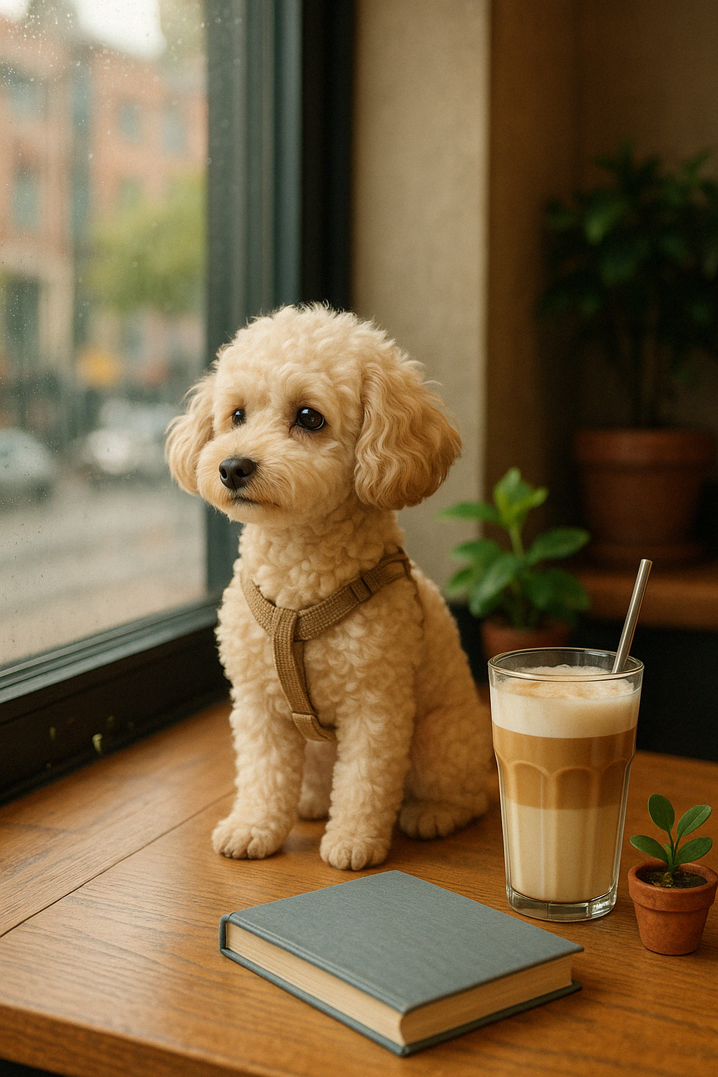 “현실적인 스타일로, 작은 강아지가 모카 라떼 옆에 앉아 커피숍 창밖을 바라보는 모습. 자연광이 들어오는 실내, 테이블 위에 놓인 책과 화분 등 소소한 디테일까지 포함해줘. 따뜻하고 감성적인 분위기.”