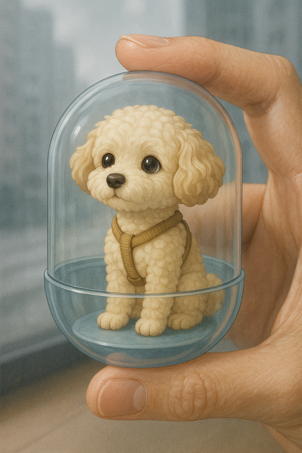 세로 구도의 이미지. 손가락 두 개 사이에 투명한 유리 질감의 가챠 캡슐이 집혀 있음. 배경은 흐릿하게 처리된 도시 거리 풍경. 캡슐 안에는 업로드한 사진 속 강아지를 모티브로 한 미니어처 치비 피규어가 들어 있고, 피규어는 전신이 보이도록 배치됨. 피규어는 실제 강아지의 외형과 털 색, 표정, 착용한 하네스를 최대한 닮도록 표현하며, 현대적인 감성의 일러스트 스타일로 그려질 것. 포즈는 창밖을 바라보며 살짝 고개를 든 자연스러운 자세로 설정. 전체적으로 사실적인 질감과 따뜻한 분위기를 유지하면서, 소품과 배경은 깔끔하고 미니멀하게 구성.