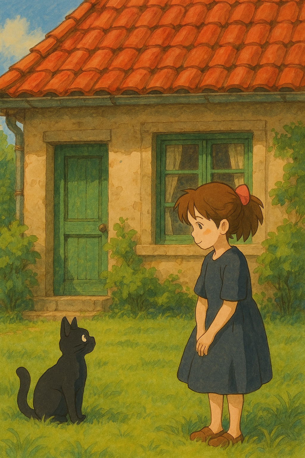 " 붉은 지붕의 집 앞에서 검은 고양이와 소녀가 마주 보고 있는 장면을 지브리풍으로 구성해줘 "