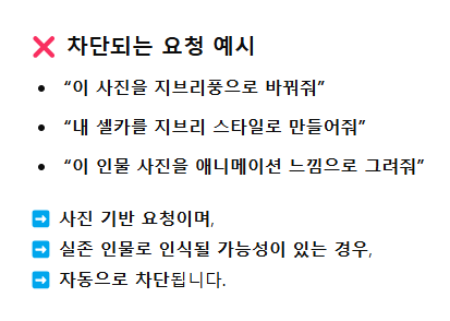 특히 사진을 기반으로 한 이미지 생성 요청에 대해 더 정교하고 엄격한 필터링을 적용하고 있습니다.