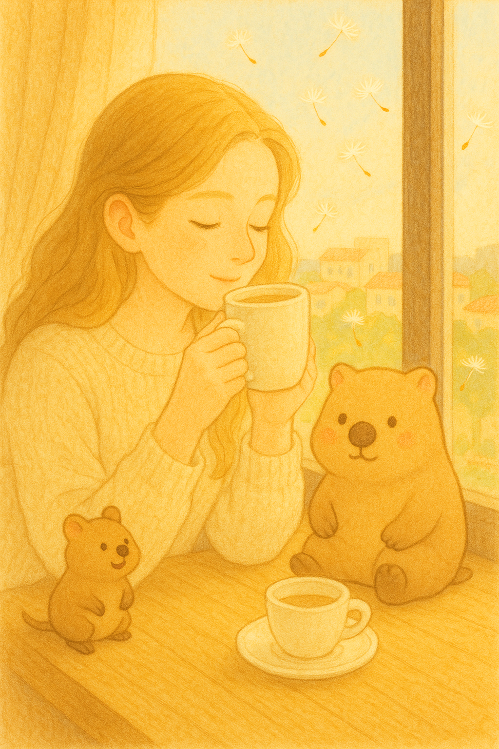 창문 너머로 햇살이 들어오고, 따뜻한 커피를 한 모금 마시는 조용한 시간.